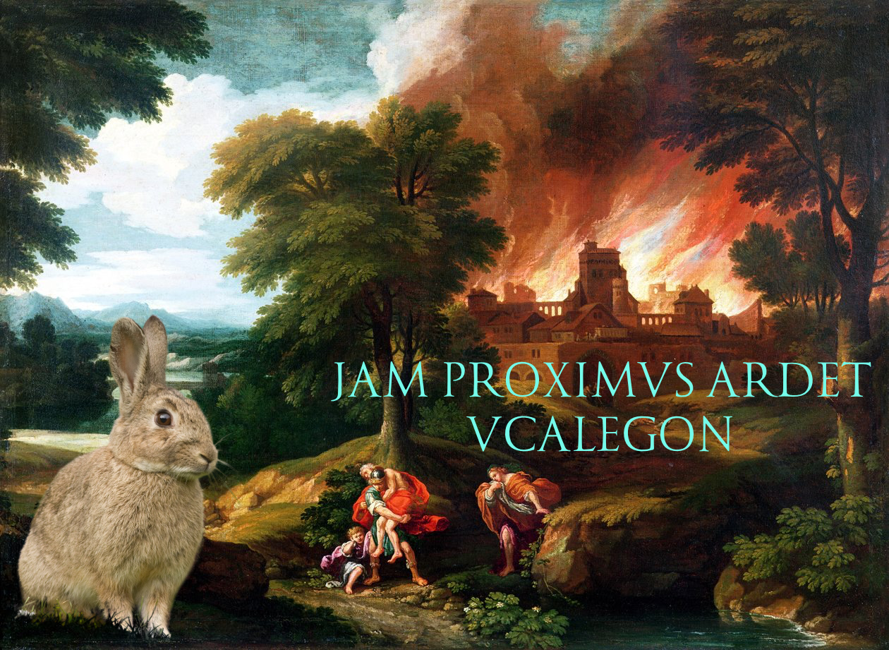 « [La maison de notre voisin] Ucalegon est déjà en feu! ». Autrement dit, ça sent le roussi, il y a péril en la demeure, le feu au lac, ça urge ! Il convient d'agir sans tarder ! L'expression nous vient de Virgile, au vers 311 du livre II de L'Énéide. Énée, le héros, prince troyen, prend précipitamment la fuite, car Troie est incendiée par les Grecs. C'est la scène où je me trouve, ami lecteur, sur le tableau qui en a été fait par Nicolas Poussin (1594-1665), le grand peintre français du XVIIe siècle. À ma gauche (au centre sur le tableau), Énée est en train de se sauver en portant Anchise, son vieux Papa, sur son dos. La citation de Virgile est un conseil de prudence : dans certains cas, il ne sert à rien de jouer les héros, et il vaut mieux éviter le danger, pour éviter une mort certaine. Cette vertu de prudence est appelée φρόνησις (phronèsis) par les Grecs. Je ne vous cache pas que ma propre nature me porte à déguerpir, dès que j'aperçois un péril. Mon cousin dans le Roman de Renart n'est-il pas Couard le lièvre ? C'est ainsi que je me suis conservé afin de pouvoir vous transmettre ma riche expérience. Mais on peut aussi, une fois le danger évité, et si c'est possible, revenir à la charge, contre-attaquer. Prendre conscience des dangers est donc très utile pour éviter le pire. Le philosophe allemand Hans Jonas, qui était latiniste, a résumé cela dans un livre publié en 1979 Le principe responsabilité : « in dubio pro malo », « dans le doute, envisage le pire ». C'est une formulation intelligente du principe de précaution. Mais assez philosophé. Il faut que je remplisse ma citerne, que je vérifie mon extincteur et relise le contrat d'assurance-incendie de mon terrier. On ne sait jamais ! Bonne rentrée, amis lecteurs !