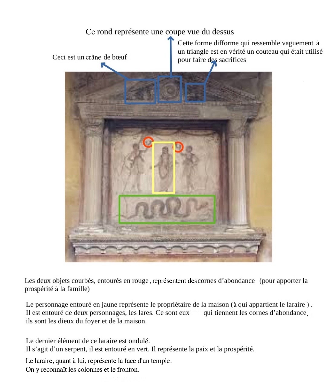 Ce texte nous apprend que le dieu Lare est lié à une famille et une maison. On apprend aussi que son culte se pratique dans la maison et se fait avec de l’encens, du vin ou avec d’autres objets comme des couronnes de fleurs.Maëlle et Emil ont repéré et décliné les mots de la première déclinaison.
